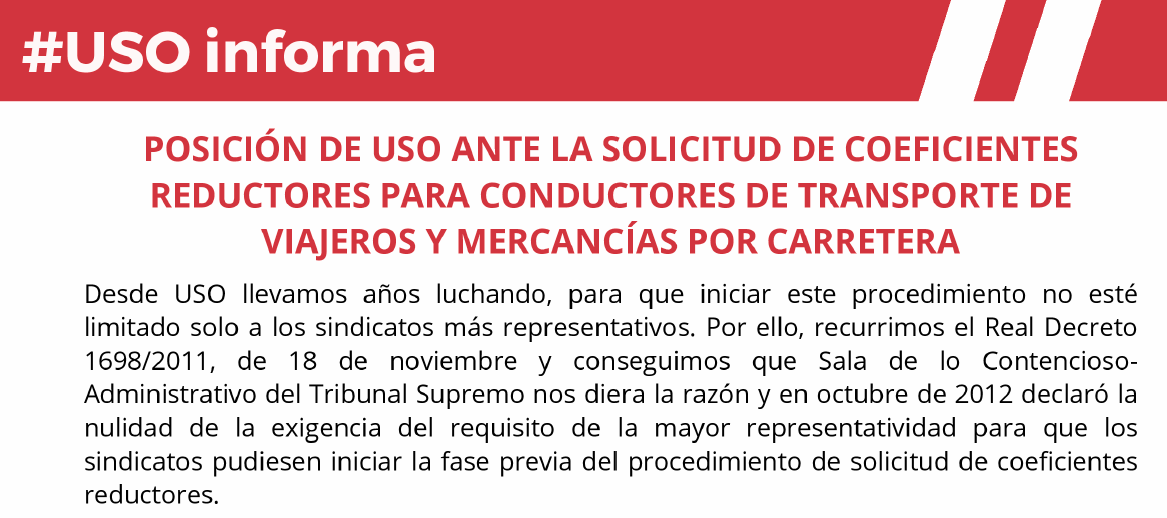 Os recordamos que USO lleva años luchando, para que iniciar este procedimiento no esté limitado sólo a los sindicatos más representativos. Por ello, recurrimos el Real Decreto 1698/2011, de 18 de noviembre y conseguimos que Sala de lo Contencioso-Administrativo del Tribunal Supremo nos diera la razón y en octubre de 2012 declaró la nulidad de la exigencia del requisito de la mayor representatividad para que los sindicatos pudiesen iniciar la fase previa del procedimiento de solicitud de coeficientes reductores.