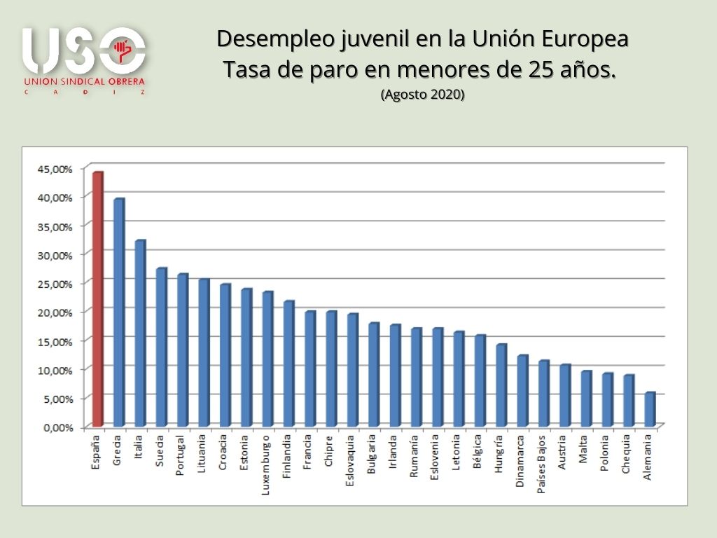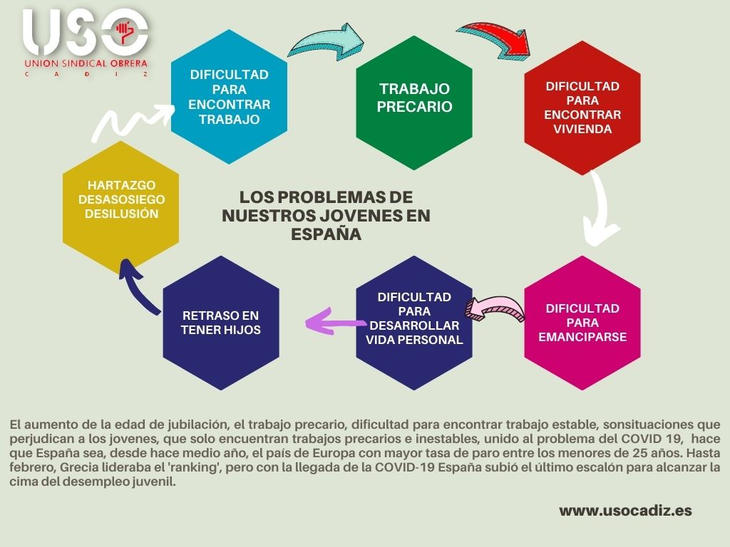 El aumento de la edad de jubilación, el trabajo precario, dificultad para encontrar trabajo estable, son situaciones que perjudican a los jóvenes, que solo encuentran trabajos precarios e inestables, unido al problema del COVID 19, hace que España sea, desde hace medio año, el país de Europa con mayor tasa de paro entre los menores de 25 años. Hasta febrero, Grecia lideraba el ‘ranking’, pero con la llegada de la COVID-19 España subió el último escalón para alcanzar la cima del desempleo juvenil.