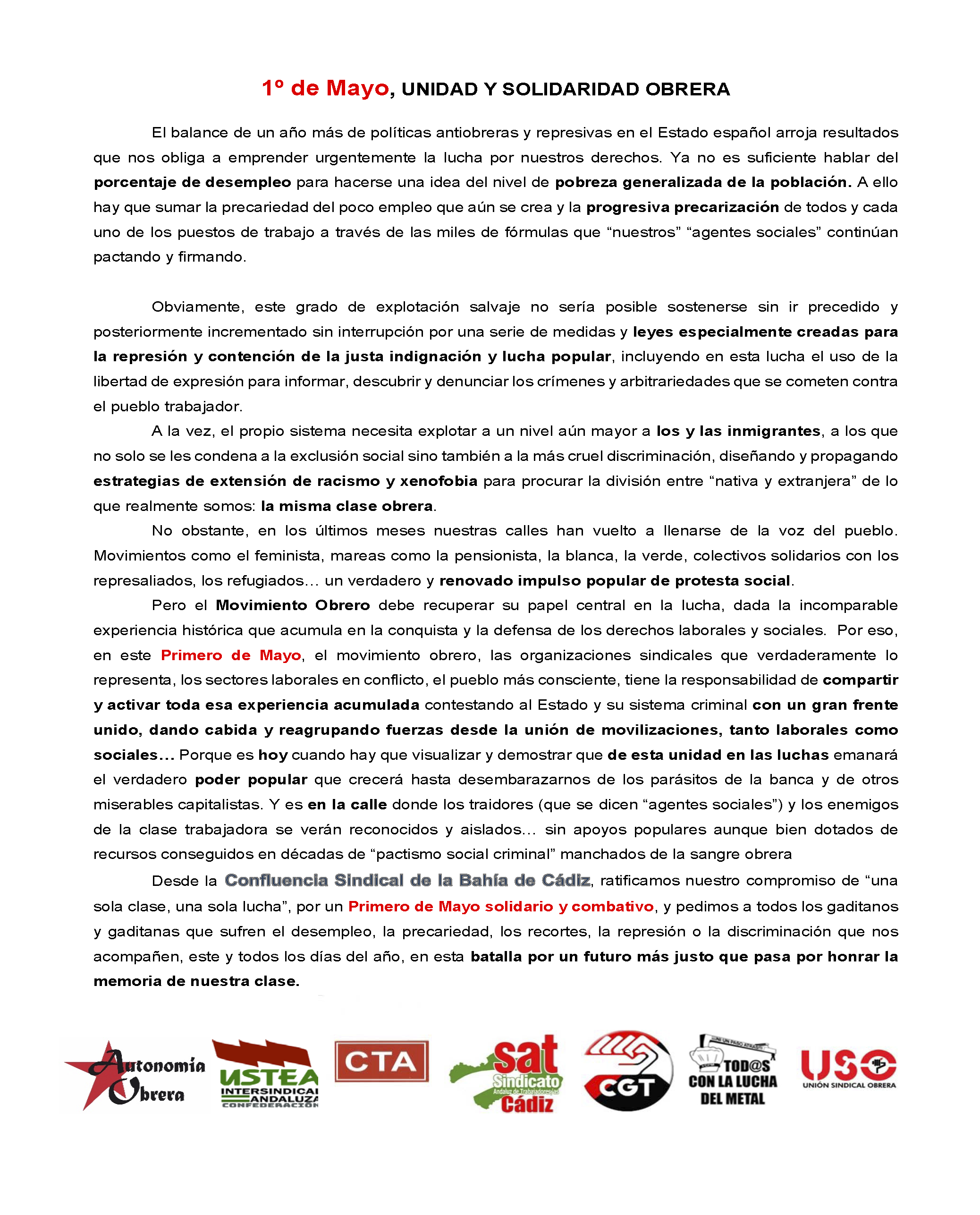 Publicado el 27/04/2018 en Manifestación del 1 de mayo en Cádiz, participa con USOMáxima resolución (2076 × 2573)