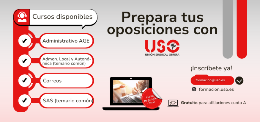 USO les ofrece a todos sus afiliados de cuota A la opción de prepararse gratis las oposiciones a varios organismos públicos. A través de nuestra plataforma de formación en línea, podrás aprender a tu ritmo y cuentas, además, con tutor. Tanto los temarios completos como el apoyo del tutor son totalmente gratuitos para nuestra afiliación de cuota A.